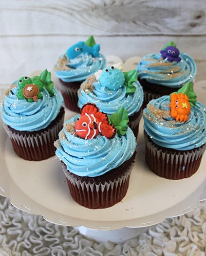Light blue buttercream frosting with assorted sugar sea creatures, sand and edible glitter.