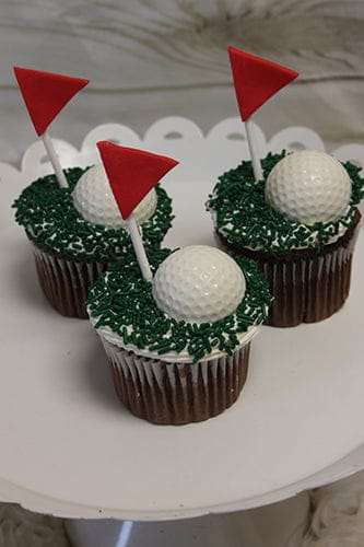 White buttercream with green sprinkles. White chocolate golf ball with red flag.