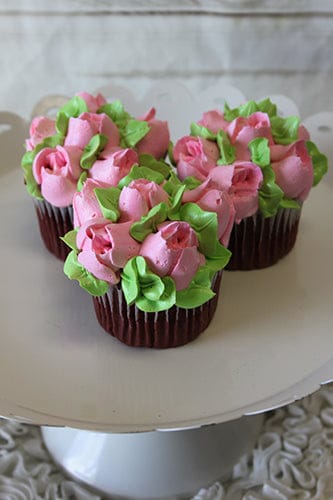 Chocolate cupcake with white mousse filling with pink floral design.