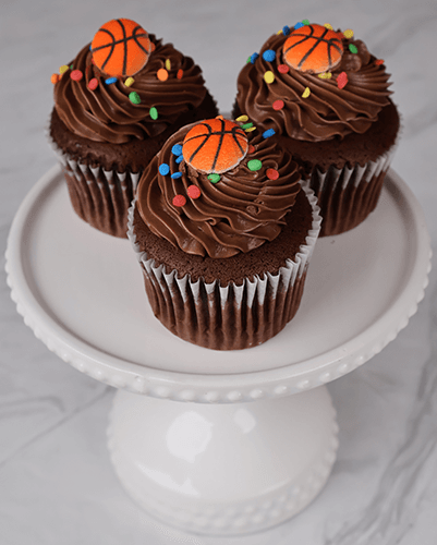 Chocolate buttercream frosting with sugar basketball and confetti.