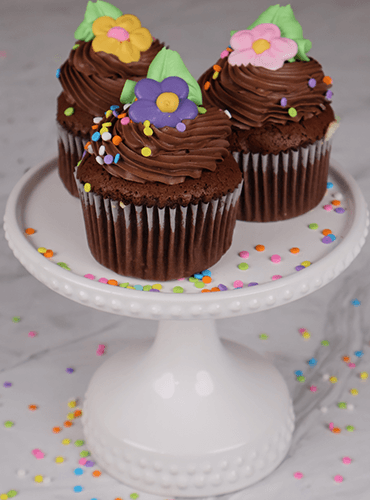 Display cupcakes. Chocolate cake with white chocolate mousse. Chocolate buttercream rosette with pastel liquid chocolate flowers.