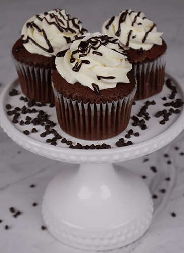 Display cupcakes. Chocolate cupcake filled and topped with whipped cream and ganache drizzle.