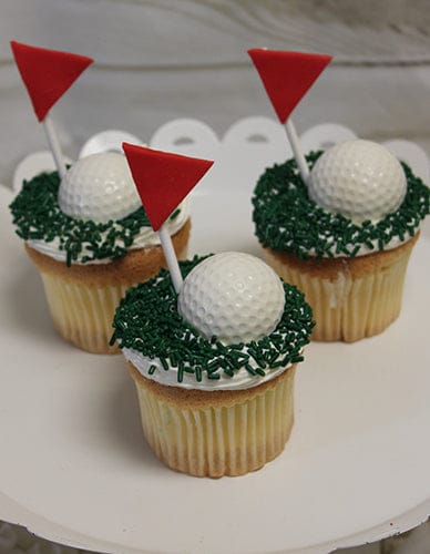 White buttercream with green sprinkles. White chocolate golf ball with red flag.
