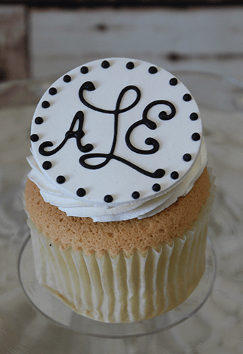 White buttercream frosting with white monogram and black letters. Please specify letters in inscription box. Three letters max