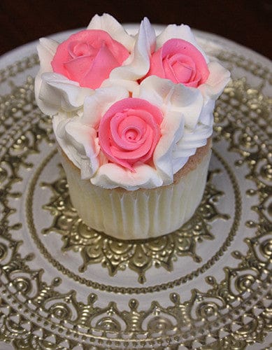 Cupcake with three mini hot pink buttercream roses with white leaves.