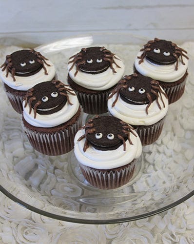 Chocolate cupcake with white mousse filling. Decorated with white buttercream and oreo spider.
