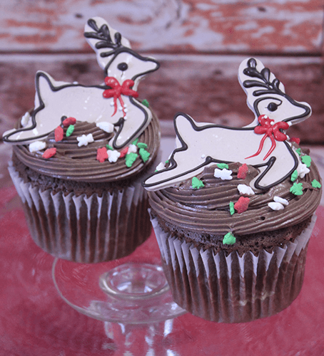 Cupcake with white buttercream rosette. Sprinkles on top with rolled chcoclate gingerbread man.