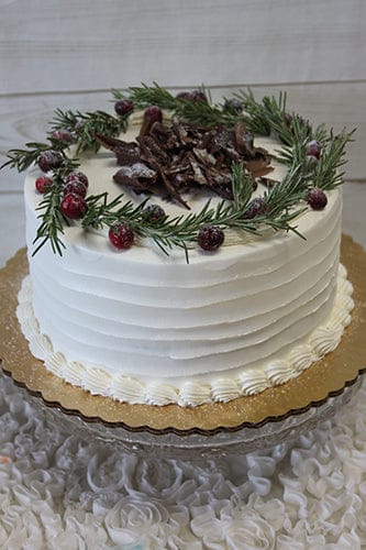 Horizontal white buttercream frosting with a ring of fresh greens and cranberries. Finished with chocolate shavings and a sprinkle of powdered sugar.