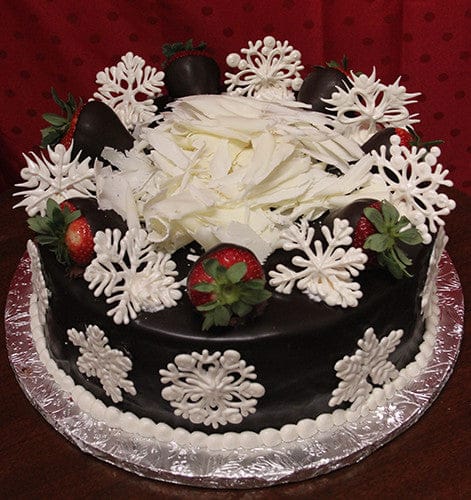 Ganache covering with white liquid chocolate snowflakes. Chocolate dipped strawberries on top with snowflakes and white chocolate shavings.