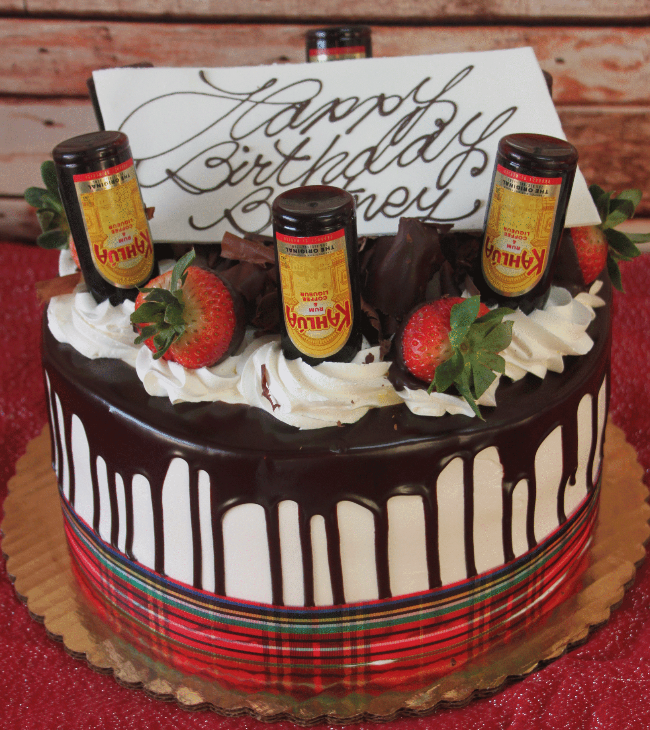 Marble cake with chocolate Kahlau mousse filling. White buttercream frosting with ganache drip. Chocolate dipped strawberries alternating Kahlau nips. Nips provided by our distributor Wollaston Liquors. Must be 21 to order and I.D. upon pick up.