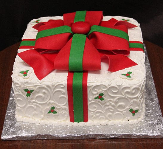 Square cake. White buttercream frosting with red and green four loop bow with straps. Holly chocolate transfers with red and white scroll all over.