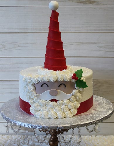 Extra high cake with white buttercream frosting and Santa face design.