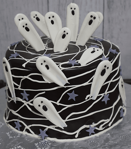 Extra high cake with ganache and ghost theme.