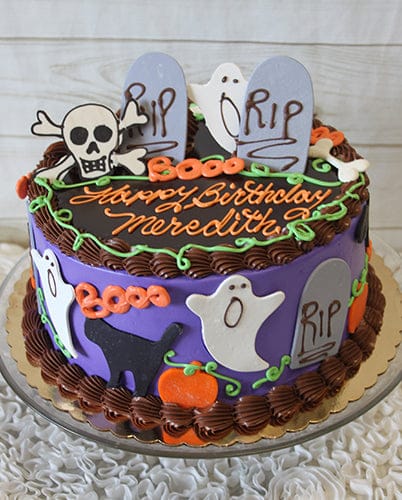 Ganache top with purple frosting on side with graveyard scene on top and on side.