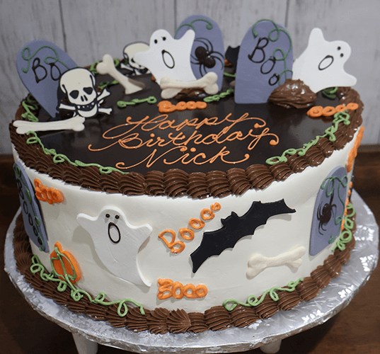 Ganache top with white frosting on side with graveyard scene on top and on side.
