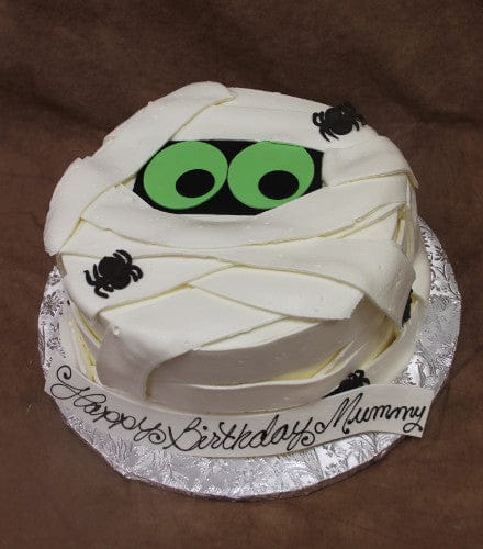 Mummy cake with butter-cream bandages, rolled chocolate eyes and spiders.