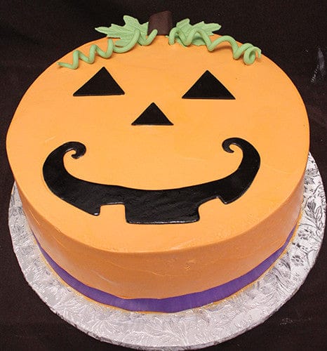 Orange buttercream frosting with purple ribbon at base. Rolled chocolate pumpkin face.