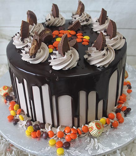 Extra high cake with white buttercream frosting and ganache drip. Ring of Reese’s Peanut Butter cups. Scattered Reese’s pieces at base.