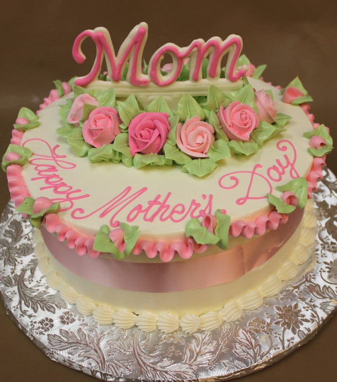 Butter cream frosting with butter cream roses. 3D “mom” sign on top. Pink ribbon around side of cake.