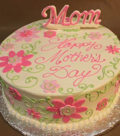 Shades of pink rolled chocolate flat daisies with green swirls and stems.Pink “mom” sign on cake.