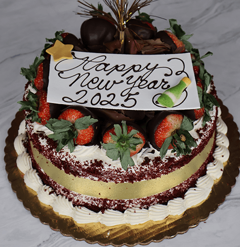 Red velvet cake with cream cheese filling. Buttercream frosting with red velvet crumbs on side. New Year’s Eve decor.