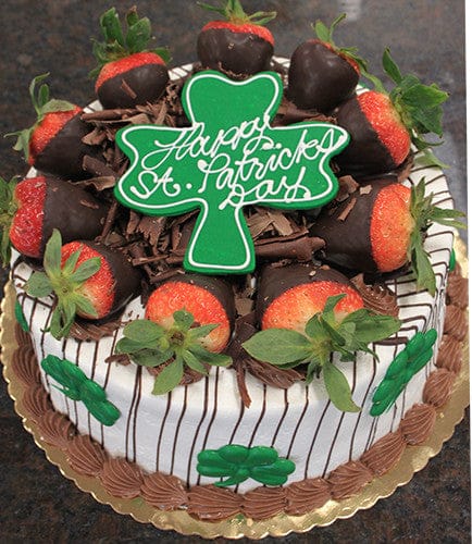 The STP-004 cake features chocolate and cream frosting, chocolate-dipped strawberries, chocolate shavings, green shamrocks, and a large green shamrock topper with “Happy St. Patrick’s Day.”.White Frosting With Strawberries And Shamrocks
