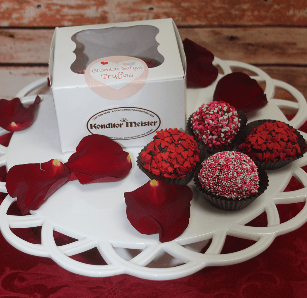 Four chocolate Bailey truffles with assorted Valentine sprinkles. Packaged in a white heart window box. Perfect treat for that someone special!