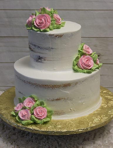 Petite 2 tier feeding 25-30 people Semi naked design with light pink roses and green leaves